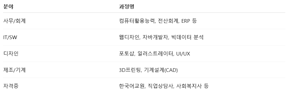 국민내일배움카드를 이용하면 수천 개의 훈련과정 중 자유롭게 선택할 수 있습니다. 최근에는 디지털·IT 분야와 전문직 자격증 과정의 인기가 높습니다.