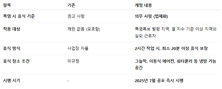 고용노동부는 이번 개정을 통해 폭염 경보가 발령되거나 열 지수가 일정 수준 이상일 경우, 야외 근로자에게 2시간마다 20분 이상 휴식을 제공하는 것을 법적으로 의무화했습니다.