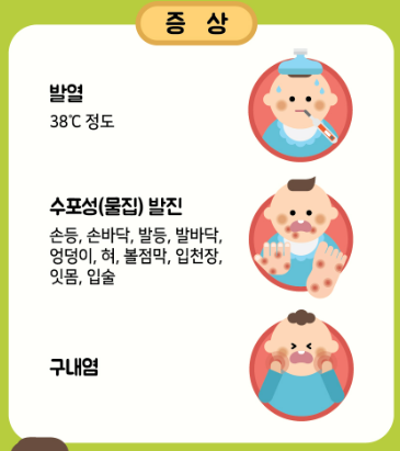 - 이후 입 안의 수포성 궤양, 손과 발의 붉은 발진 또는 수포가 나타나며, 심한 경우 물집이 터지면서 통증을 유발합니다.