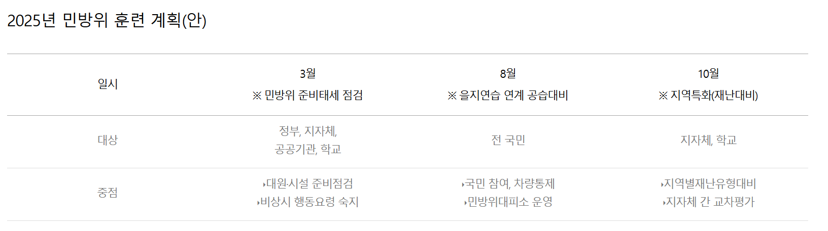 따라서 이번 민방위훈련에 국민 모두가 적극적으로 참여하여 실제 상황에 대비하는 습관을 기르고, 안전한 대한민국을 함께 만들어 나가는 계기가 되기를 기대한다.