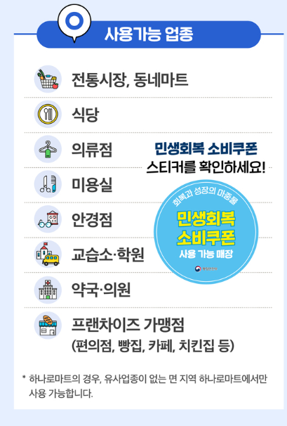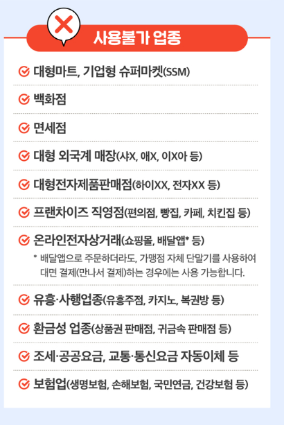 사용 가능 업종은 전통시장, 동네마트, 식당, 학원, 미용실, 약국, 의원, 소규모 프랜차이즈 가맹점(편의점, 제과점, 카페 등)입니다. 반대로 대형마트, 백화점, 면세점, 대형 외국계 매장, 온라인 쇼핑몰, 유흥업소 등에서는 사용이 불가합니다. 같은 브랜드라 하더라도 직영점은 제한되고, 가맹점만 가능할 수 있으므로 매장 입구에 부착된 ‘사용 가능 매장’ 스티커를 꼭 확인하는 것이 안전합니다.