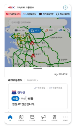 앱의 첫 화면에는 ‘교통지도’가 표시되며, 내 위치 주변의 정체 구간이 자동으로 나타납니다. 상단에는 ‘속도정보’, ‘돌발’, ‘CCTV’, ‘휴게소’ 메뉴가 각각 아이콘 형태로 구성되어 있어 손쉽게 이동할 수 있습니다. 특히 ‘돌발’ 메뉴에서는 사고나 공사 등의 이슈가 발생할 때 즉시 알림이 표시되며, 클릭 시 상세 위치와 사고 원인이 함께 안내됩니다.